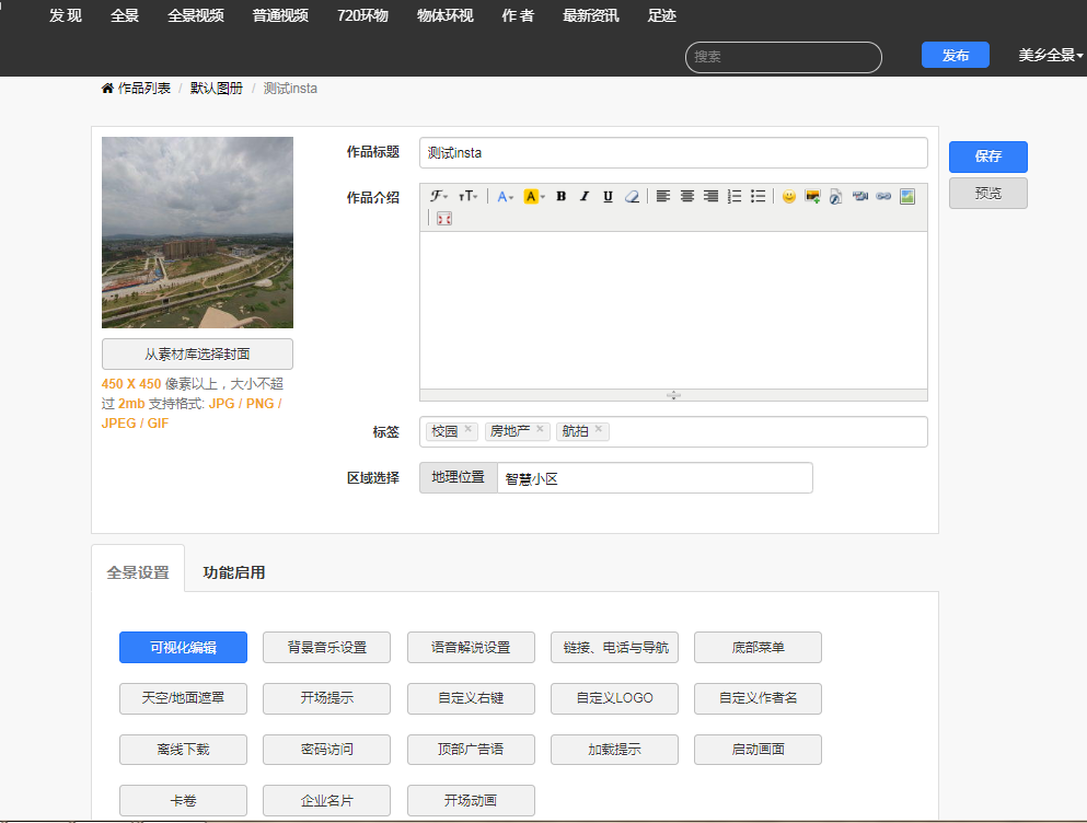 进入可视化编辑后,可以对多个场景进行初始视角设置、视角角度设置、全景切换、超链接、贴图、贴视频、环物热点、场景红包、沙盘标记、天气特效、全景导览等。点击右上角保存之后,全网展示作品则实时更新,十分方便后期的调整和修改。